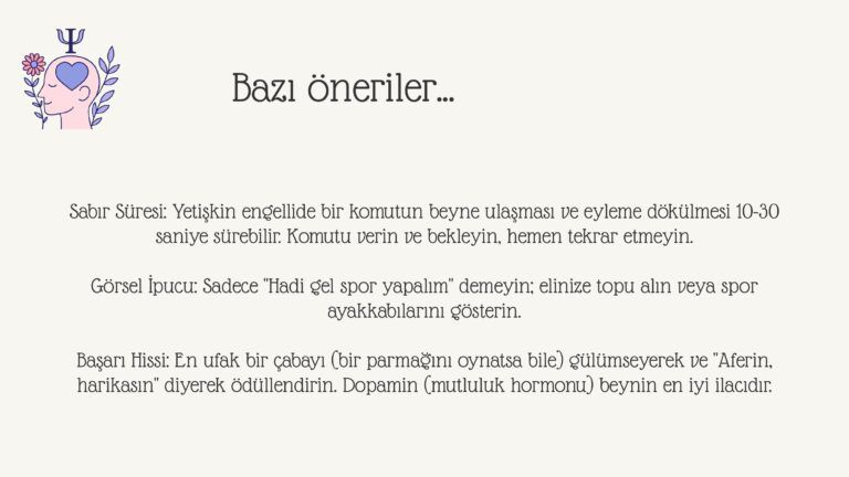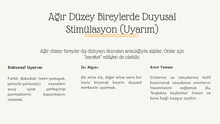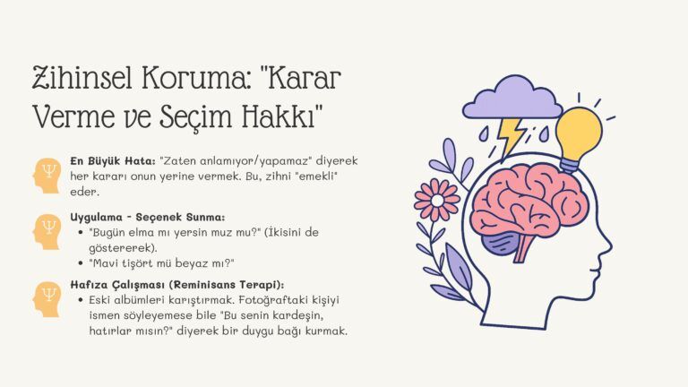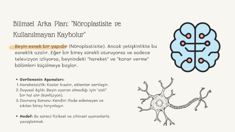 Yetişkinlik dönemindeki özel gereksinimli bireylerde yaşam kalitesini artırmanın temel yolu, mevcut becerilerin korunması ve fonksiyonelliğin sürdürülmesidir. Bu eğitimimiz; bireylerin zihinsel ve fiziksel kapasitelerini “kullanılmayan kaybolur” prensibiyle korumayı hedeflemektedir. Hazırladığımız bu çalışma kapsamında öne çıkan stratejik yaklaşımlar: • Bilişsel Koruma: Karar verme süreçlerine katılım ve seçenek sunma yoluyla zihinsel aktivitenin canlı tutulması. • Duyusal Uyarım: Isı, doku ve ritim uyarımı ile sinir sisteminin regüle edilmesi. • Ev İçi Meşguliyet Terapisi: Günlük rutinlerin (eşleştirme, ayıklama, düzenleme) birer rehabilitasyon aracına dönüştürülmesi. Amacımız, bireyin çevresiyle olan etkileşimini güçlendirerek gerileme sürecini minimumda tutmak ve başarı hissini desteklemektir.